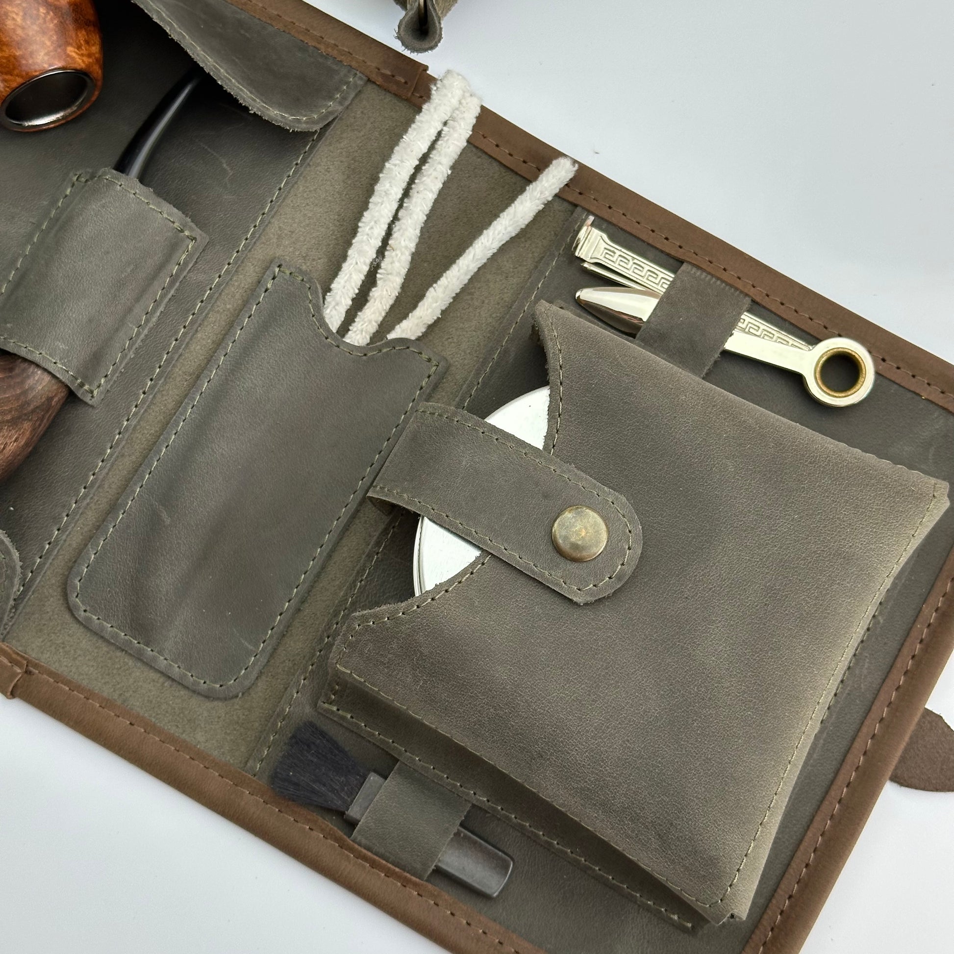 Leather Pipe Roll for Two Pipes, Pipe Pouch with Tray and Stander, Travel Tobacco Leather Bag